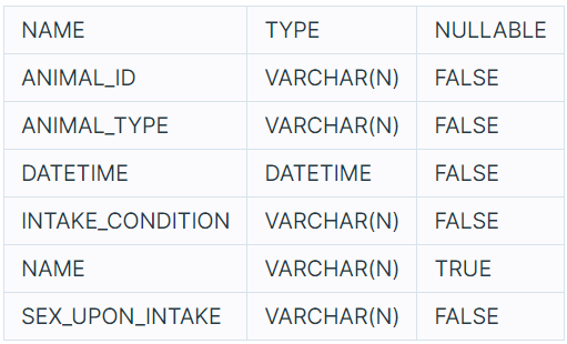 | ANIMAL_ID | ANIMAL_TYPE | DATETIME | INTAKE_CONDITION | NAME | SEX_UPON_INTAKE |