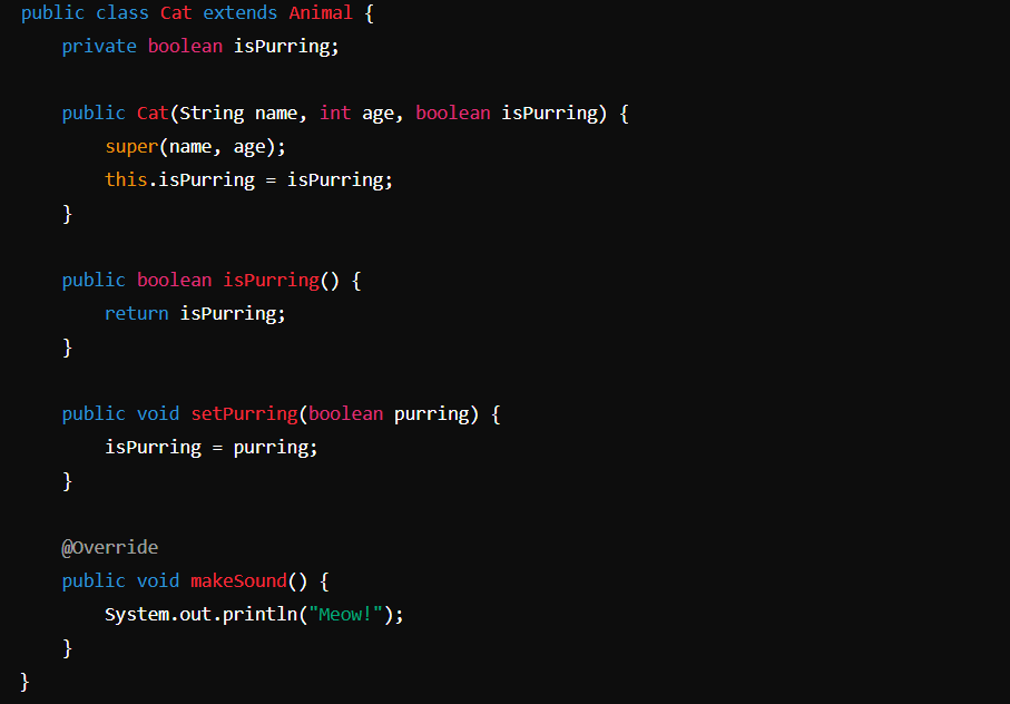 System.out.println("Name: " + myCat.getName() + ", Age: " + myCat.getAge() + ", Purring: " + myCat.isPurring());