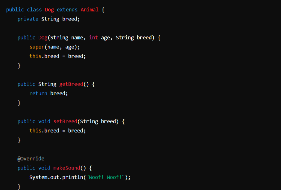 System.out.println("Name: " + myDog.getName() + ", Age: " + myDog.getAge() + ", Breed: " + myDog.getBreed());