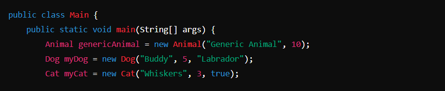 이제 메인 클래스에서 위에서 정의한 동물 클래스들을 사용해보겠습니다.