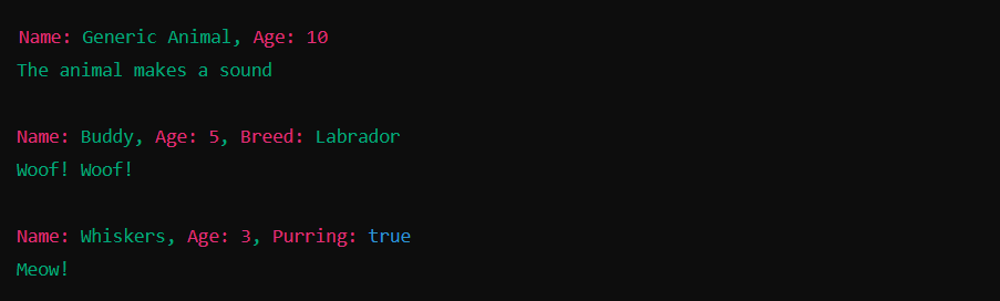 위의 메인 클래스를 실행하면 각 동물 객체들이 생성되고 해당하는 메소드가 호출됩니다.